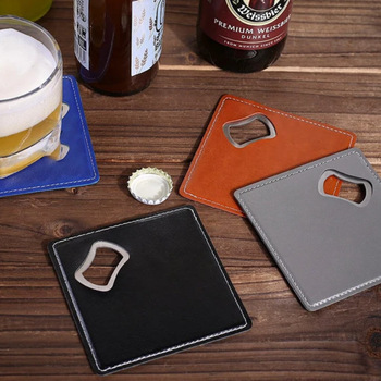 Posavasos de PU cuadrados multifunción de 10cm, alfombrilla para taza, abridor de botellas de cerveza de acero inoxidable